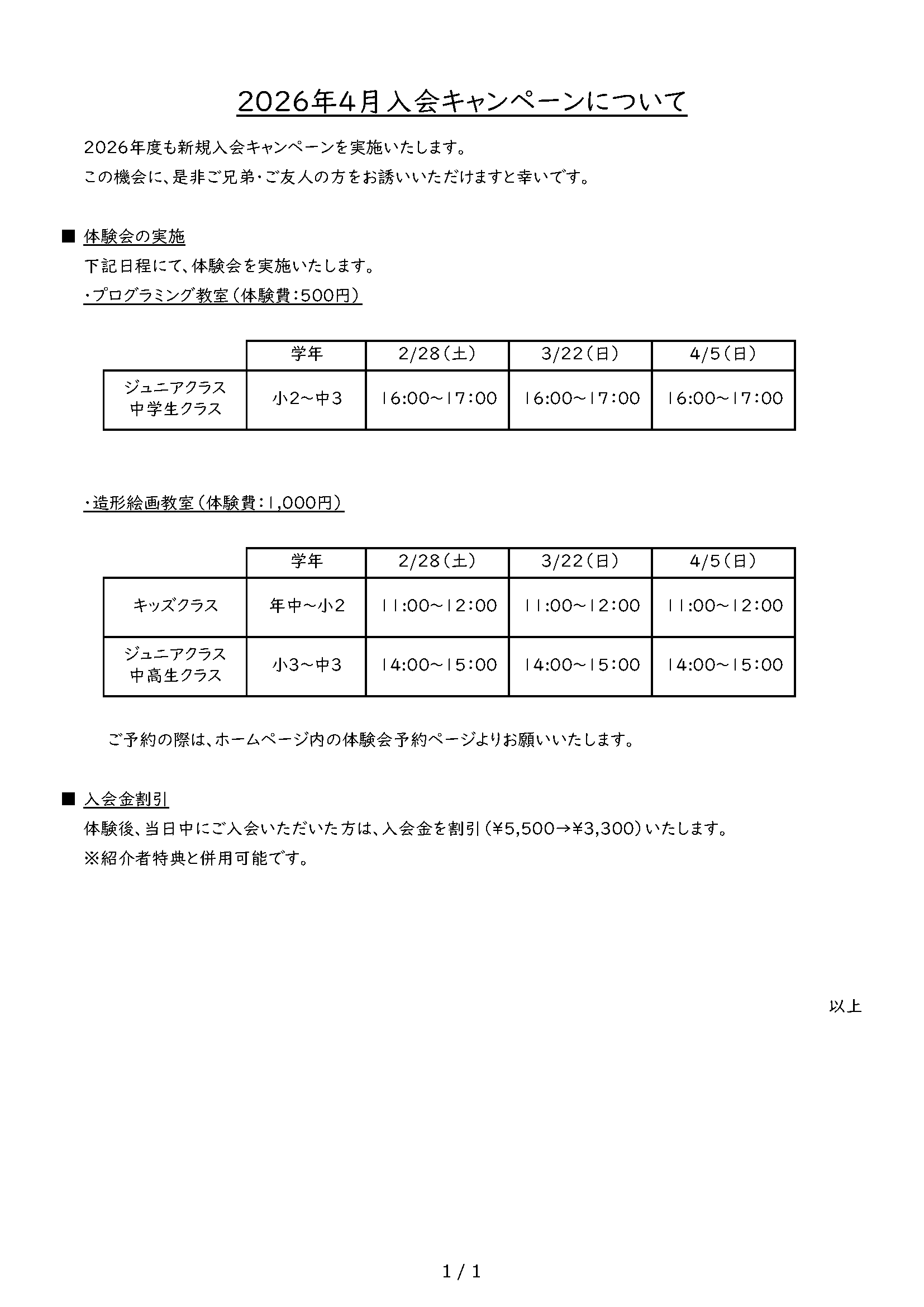 2026年度4月入会向け体験会日程を決定しました!